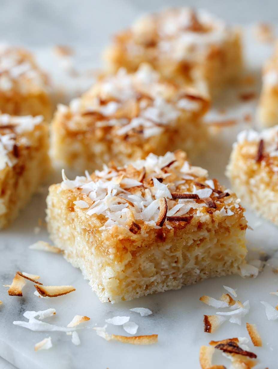 • This recipe came about on a rainy afternoon when I was craving something sweet but didn’t want to turn on the oven. I remembered my grandmother’s coconut bars — simple, no fuss, and packed with flavor. I played around with the ingredients until I found that perfect balance of chewy, crunchy, and coconutty, and now I keep these around for easy snacking.